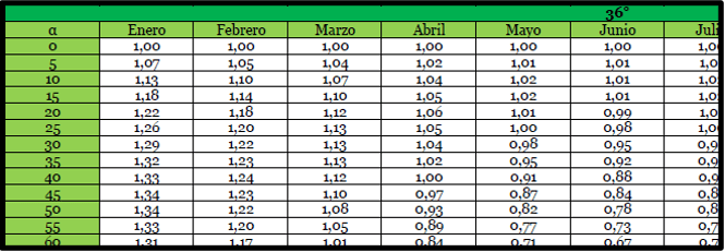 El factor corrector kα para superficies inclinadas puede consultarse en el documento adjunto al final de la entrada titulado «Factor de corrección Kα para superficies inclinadas«, en el se exponen varias tablas para diferentes latitudes, que recogen el valor del parámetro en función de la inclinación del módulo y el mes del año considerado.