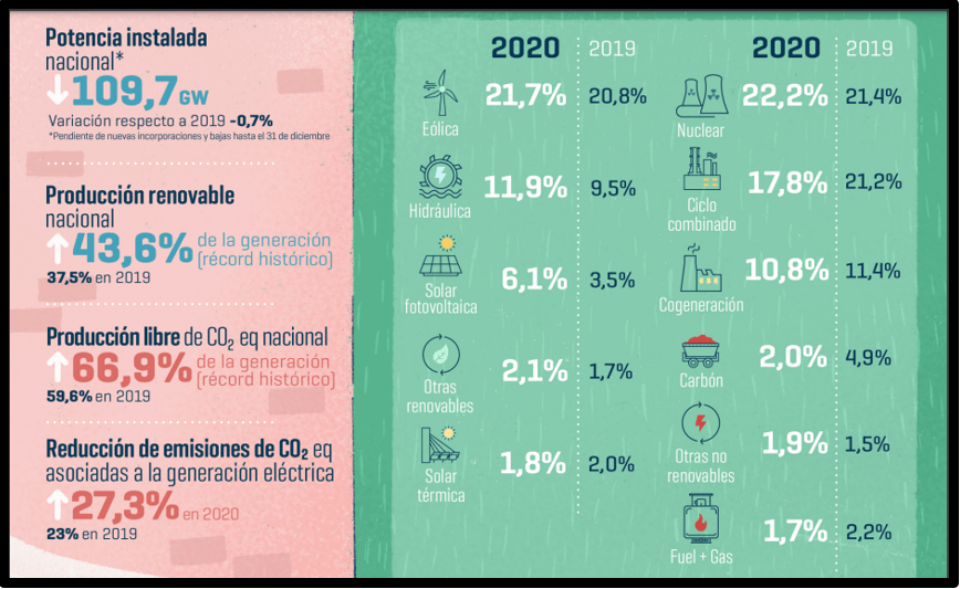 Por ejemplo, según Red Eléctrica Española, las emisiones de GEI del sistema eléctrico español en el año 2020 fueron de ~ 0,14 [kg CO2 eq. / kWh] (0,19 [kg CO2 eq. / kWh] en 2019), logrando cubrir el 66,9% de la demanda con tecnologías libres de CO2.
