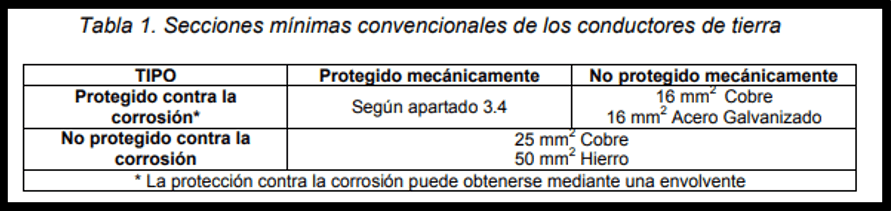 Los conductores de tierra (3) también deberán cumplir los mismos requisitos que los conductores de protección (1) y en el caso de que estén enterrados deben estar de acuerdo a las condiciones de la siguiente tabla (señalar que el apartado 3.4 se refiere a los criterios de los conductores de protección). Cabe destacar que en la práctica lo más habitual es el empleo de cables de 35 o 50 [mm2] de cobre independientemente de la potencia de la instalación para la unión entre electrodos.
