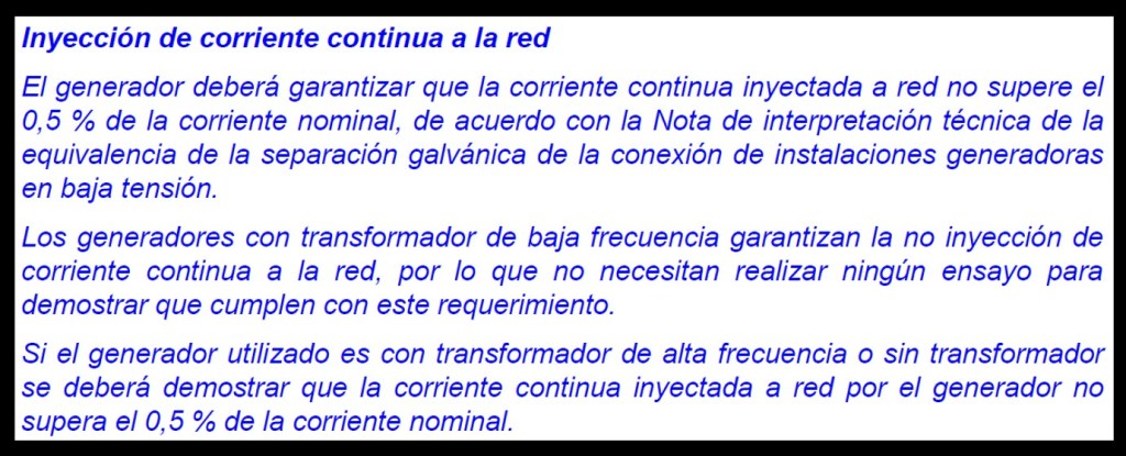 El REBT en ningún punto aborda este tema, no obstante, el documento guía BT-40 (Edición: sept-13 | Revisión: 1) y la Nota de interpretación técnica de la equivalencia de la separación galvánica de la conexión de instalaciones generadoras en baja tensión (Edición: 0 | Revisión: R01) indican que la separación galvánica quedará probada si el generador garantiza que la corriente continua inyectada a red no supera el 0,5% de la corriente nominal.