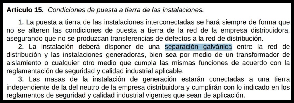 El Real Decreto 1699/2011, de 18 de noviembre, por el que se regula la conexión a red de instalaciones de producción de energía eléctrica de pequeña potencia, establece en su Artículo 15 Punto 2 que las instalaciones deben disponer de una separación galvánica con la red de distribución.