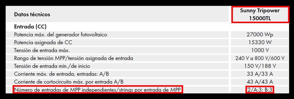 Como se puede observar en las fichas técnicas adjuntadas, el inversor de corriente dispone de 3 entradas por MPPT, por otro lado, el panel tiene una intensidad de cortocircuito de 10,10 [A] y admite fusibles de hasta 25 [A]: