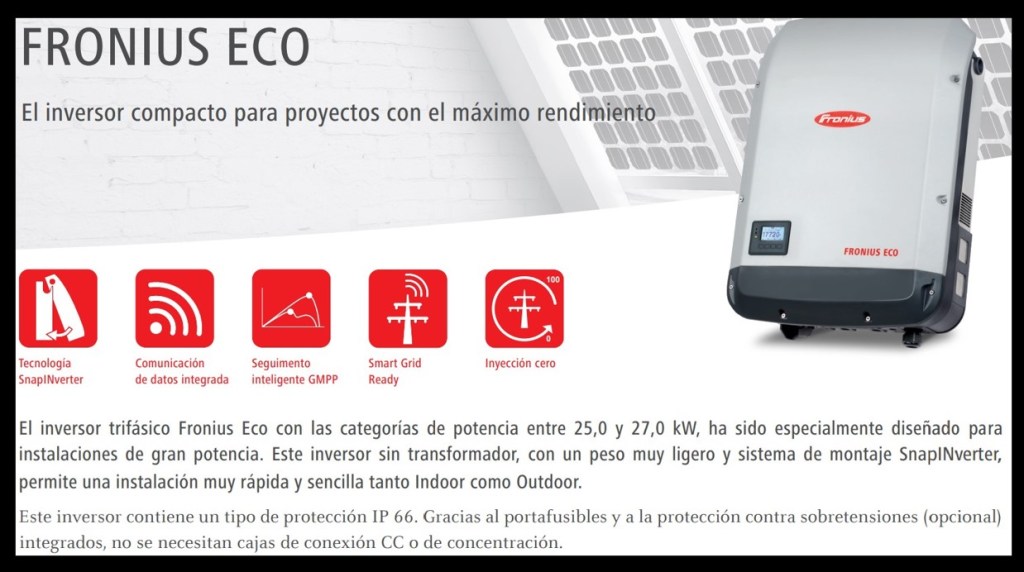 - Utilizar inversores con fusibles integrados: existen algunos modelos que vienen de fábrica con fusibles o portafusibles equipados en la parte de corriente continua, lo cual permite prescindir de instalar estos fuera en un cuadro adicional (e.g Fronius ECO). Cabe advertir que estos equipos son muy poco habituales.