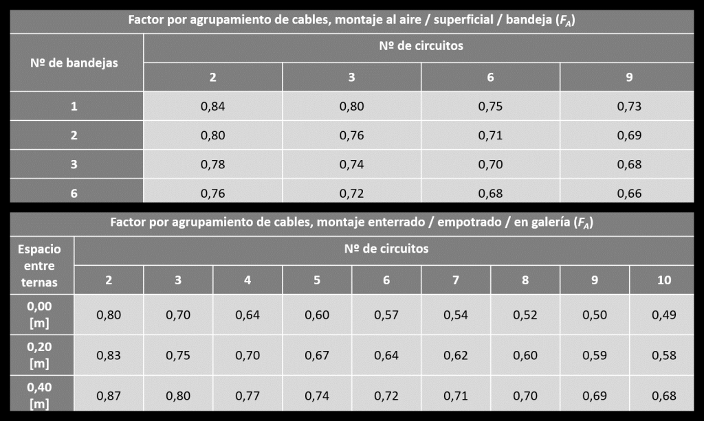 | FA ≡ Factor por agrupamiento de cables juntos o tubos en una misma zanja ≡ [-] NOTA 1: en instalaciones al aire se recomienda usar la Tabla Nº18 de la ITC-LAT 06. NOTA 2: en instalaciones enterradas se debe consultar la Tabla Nº10 de la ITC-LAT 06. |