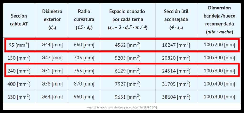 | Sección cable AT | Diámetro exterior (de) | Radio curvatura (15 · de) | Espacio ocupado por cada terna (se = 3 · de² · π / 4) | Sección útil aconsejada (4 · se) | Dimensión bandeja/hueco recomendada (alto · ancho) |