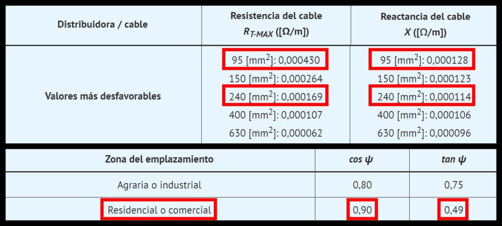 | Valores más desfavorables | 95 [mm2]: 0,000430 150 [mm2]: 0,000264 240 [mm2]: 0,000169 400 [mm2]: 0,000107 630 [mm2]: 0,000062 | 95 [mm2]: 0,000128 150 [mm2]: 0,000123 240 [mm2]: 0,000114 400 [mm2]: 0,000106 630 [mm2]: 0,000096 |