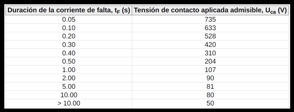 | UCA | Tensión de contacto aplicada admisible, depende del tiempo de despeje de falta Nota: consultar la Tabla 1 de la ITC-RAT-13, el tiempo de despeje lo facilita la distribuidora | [V] |