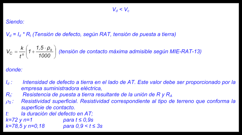 El Punto 11 de la ITC-BT-18 del REBT establece que esta configuración de puesta a tierra solo puede ejecutarse cuando la tensión de contacto máxima admisible (UC), calculada acorde a lo indicado en el Punto 1 de la ITC-RAT-13, sea mayor a la tensión de defecto a tierra (UD).