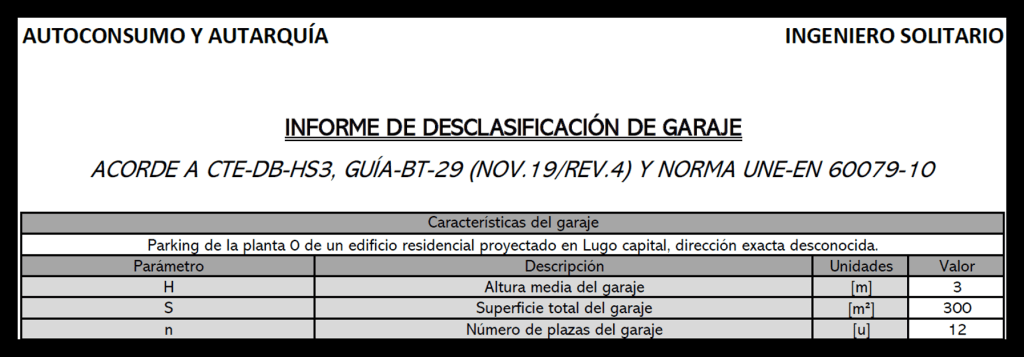Se desea elaborar el informe de desclasificación de un garaje residencial de un edificio proyectado en Lugo capital de 12 plazas, que tiene una superficie total de 300 [m2] (20 x 15 [m]). Las paredes oeste y este del emplazamiento dan a la vía pública y la altura libre media estimada es de 3 [m]. Para la redacción del documento se empleará el excel adjunto anteriormente.