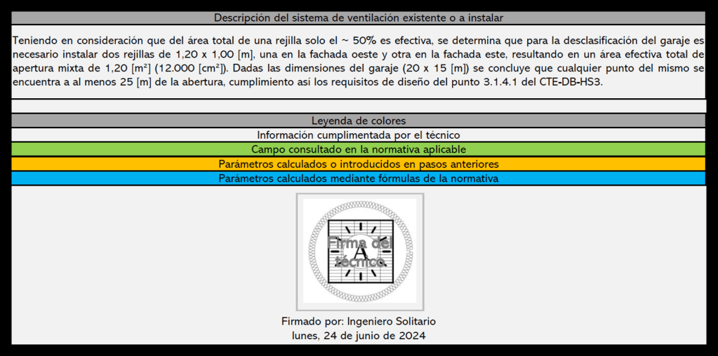 Después se describe el sistema de ventilación a implantar en función de los resultados obtenidos, las características del garaje y las exigencias de diseño del CTE-DB-HS3, además se firma el documento para conste a efectos oportunos. Cabe aclarar que en este caso solo se emplea ventilación natural:
