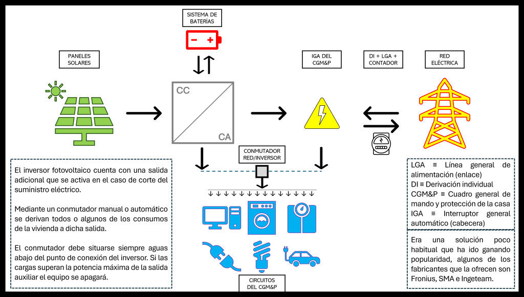 Existen cada vez más modelos inversores que disponen de dos salidas en corriente alterna (CA), una para el funcionamiento normal con la red eléctrica activa y otra que habitualmente solo se habilita en caso de apagón para la alimentación de cargas críticas o incluso de toda la vivienda dependiendo de la potencia requerida y de la que pueda entregar esta salida auxiliar.